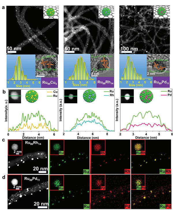 图1. RuM/CNTs (M = Cu、Rh、Pd)的尺寸和组分表征。