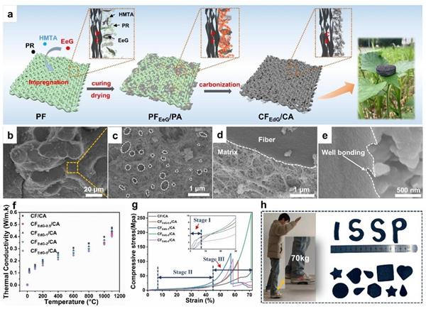 图1. 碳纤维增强碳基气凝胶复合材料的(a)制备流程图;(b-e)微观表征;(f)不同温度热导率;(g)压缩应力-应变曲线及(h)成型加工性能。