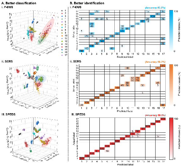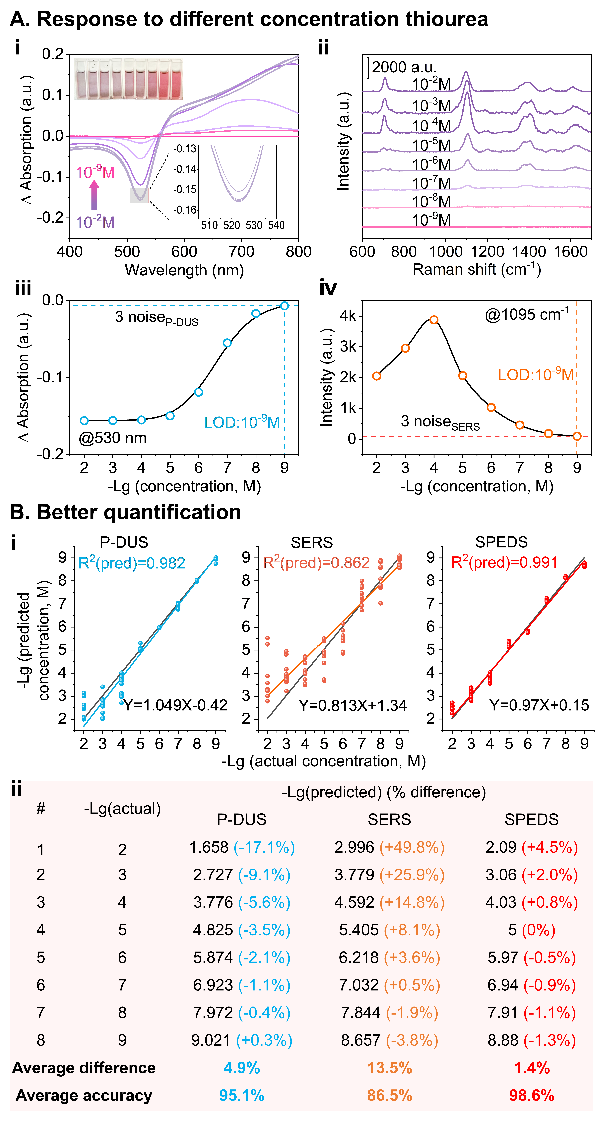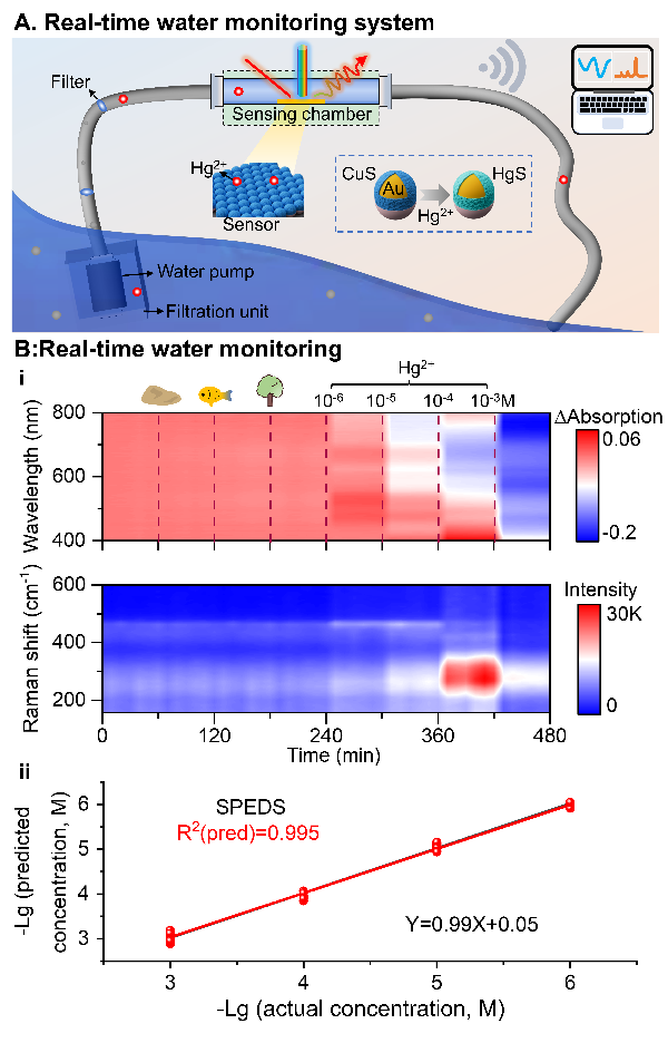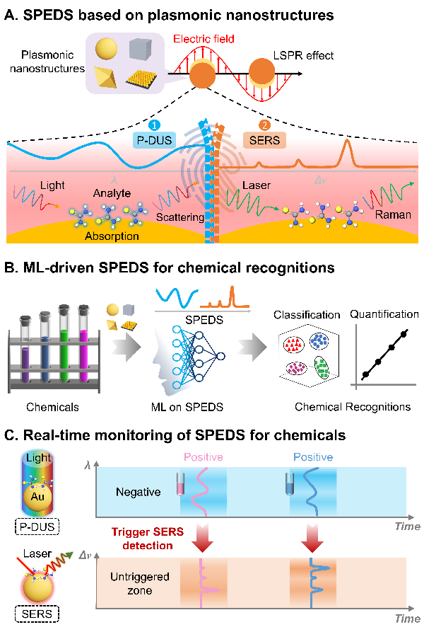 为解决上述难题,研究团队将高识别率的表面增强拉曼光谱技术(SERS)与实时的等离子体介导的差分紫外-可见光谱技术(P-DUS)相结合,开发了一种兼具高灵敏度、特异性与实时性的新型分析技术——表面等离子体增强双光谱技术(SPEDS)。将SPEDS技术用于金胶体体系中多种化学分子的识别与定量分析,利用SPEDS提供的丰富分子信息及其与机器学习算法的集成,实现目标分子定量准确率高达98.6%、识别准确率高达98.2%,准确率显著优于单一的SERS技术和P-DUS技术。研究人员进一步将SPEDS技术成功拓展至多种等离子体纳米结构体系,展示出SPEDS技术良好的通用性与可扩展性。此外,研究人员还通过CuS涂覆的金纳米阵列实现了对实际水样中Hg2+浓度的实时监测,表明SPEDS技术在环境污染物监测领域具有实际应用价值。该研究为构建集超高灵敏度、实时响应与智能识别于一体的危险化学品监测提供了新思路,为应对环境污染、公共健康威胁和工业安全监控等挑战提供了关键传感技术支撑。