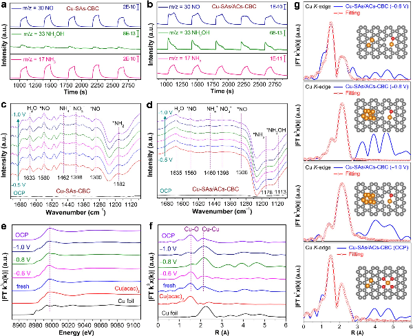 图2. (a) Cu-SAs-CBC和(b) Cu-SAs/ACs-CBC在最佳电位下对应的原位DEMS测试图;(c) Cu-SAs/ACs-CBC和(d) Cu-SAs/ACs-CBC在不同电位下对应的原位ATR-SEIRAS谱;(e) Cu-SAs/ACs-CBC在不同电位下对应的原位Cu K-edge XANES谱;(f) Cu-SAs/ACs-CBC在不同电位下对应的k³加权FT-EXAFS谱;(g) Cu-SAs/ACs-CBC在不同电位下对应的R空间Cu K-edge EXAFS拟合曲线。插图为电化学反应过程中Cu-SAs/ACs-CBC的配位构型(黑色:C,红色:O,黄色:Cu)。